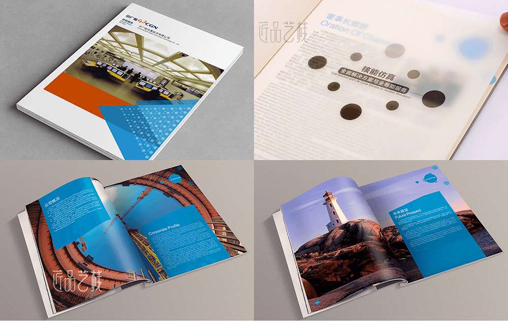 画册设计中的统一性策略,不能单纯理解为版式统一性。而更多指统一的风格或创意元素,把整本画册贯穿起来,形成整本画册的统一形象。如在中广核的企业画册设计中,我们采用其核裂变的品牌元素,以灵活的组合设计方式,不仅有效提升画册的视觉形象和统一性,更能有效传播其品牌经营理念。