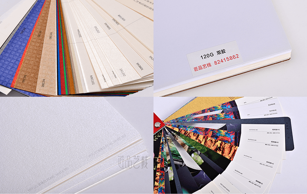 一为按“系列”选:即根据画册设计方案选择纸张。如对产品颜色还原度要求较高,通常建议采用双铜纸、哑粉纸、涂布纸等;如对画册艺术性要强的,通常建议采用艺术纸、花纹纸等;而如对质感要求较强,也可选用珠光系列纸张。