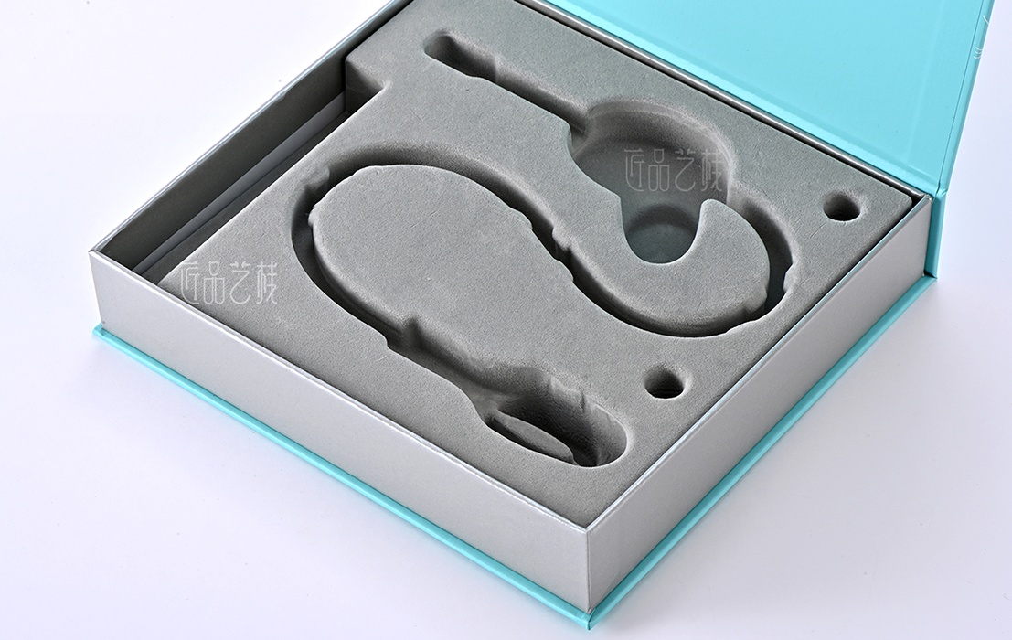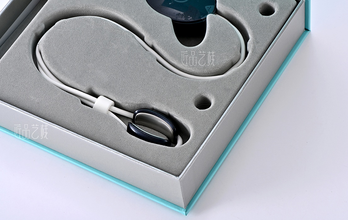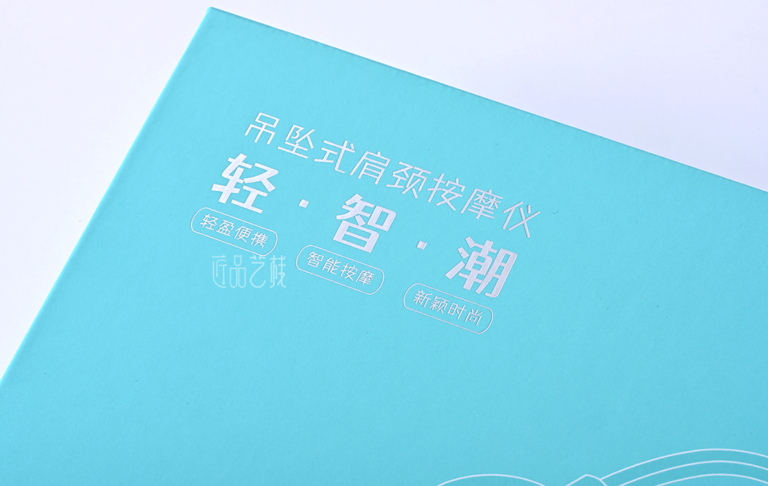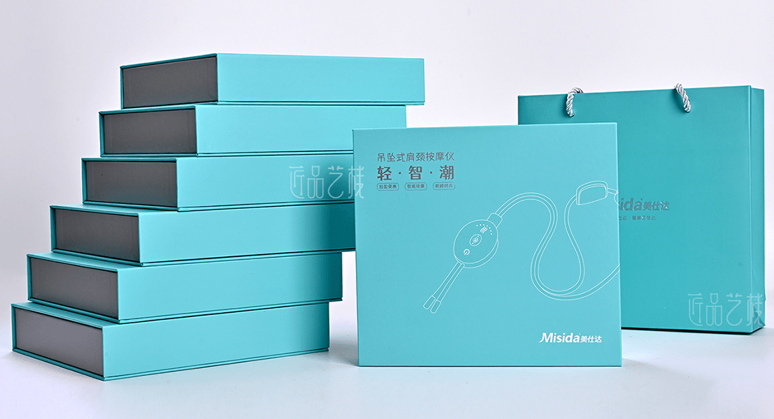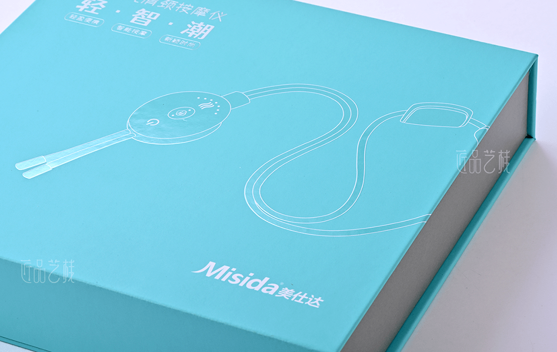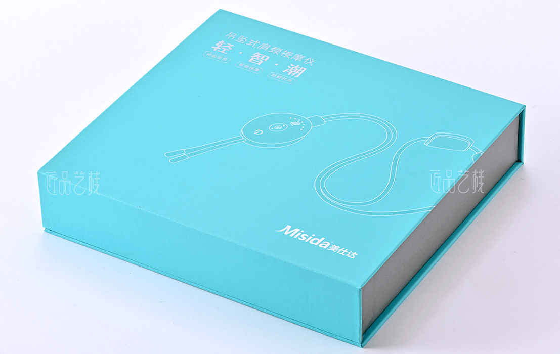 在该肩颈按摩仪包装盒定制合作中,以简约时尚的蓝色调为基,