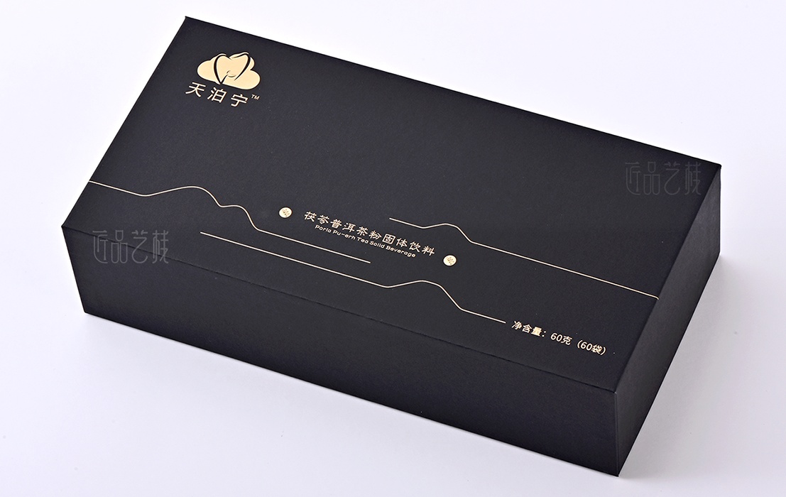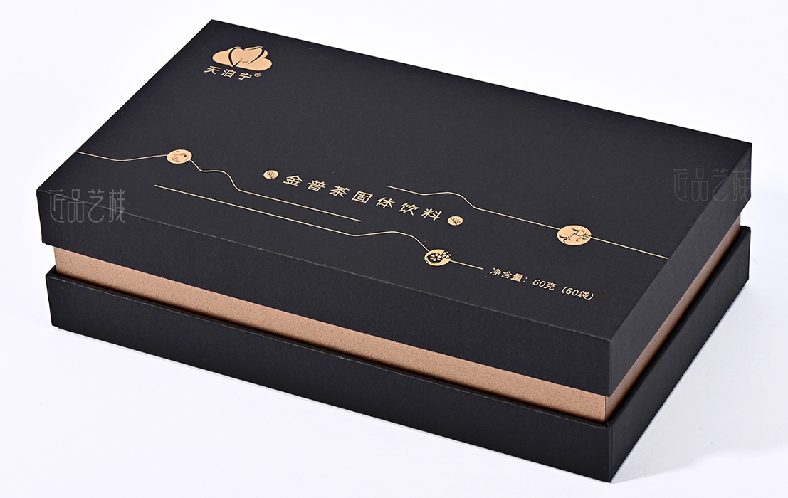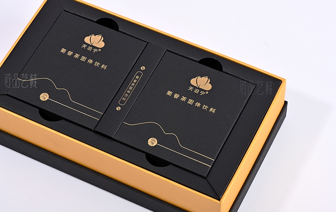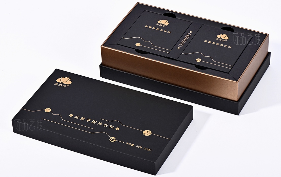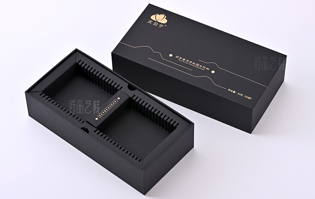 依托a级黑色卡纸为包装盒主体,点辍精致烫金工艺,