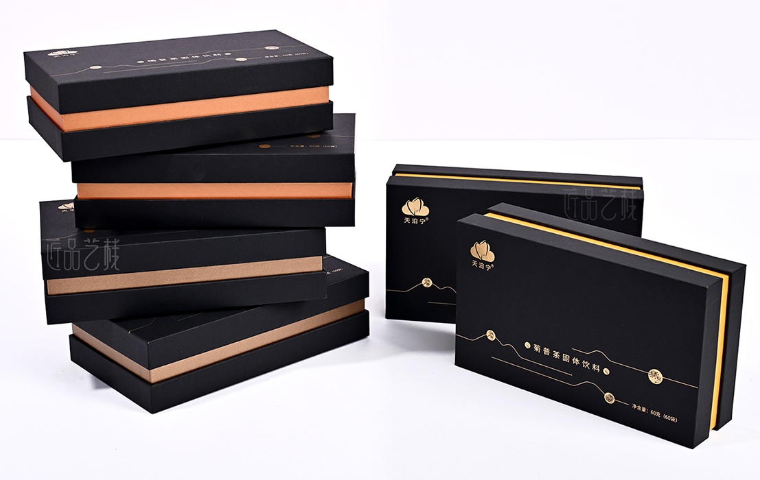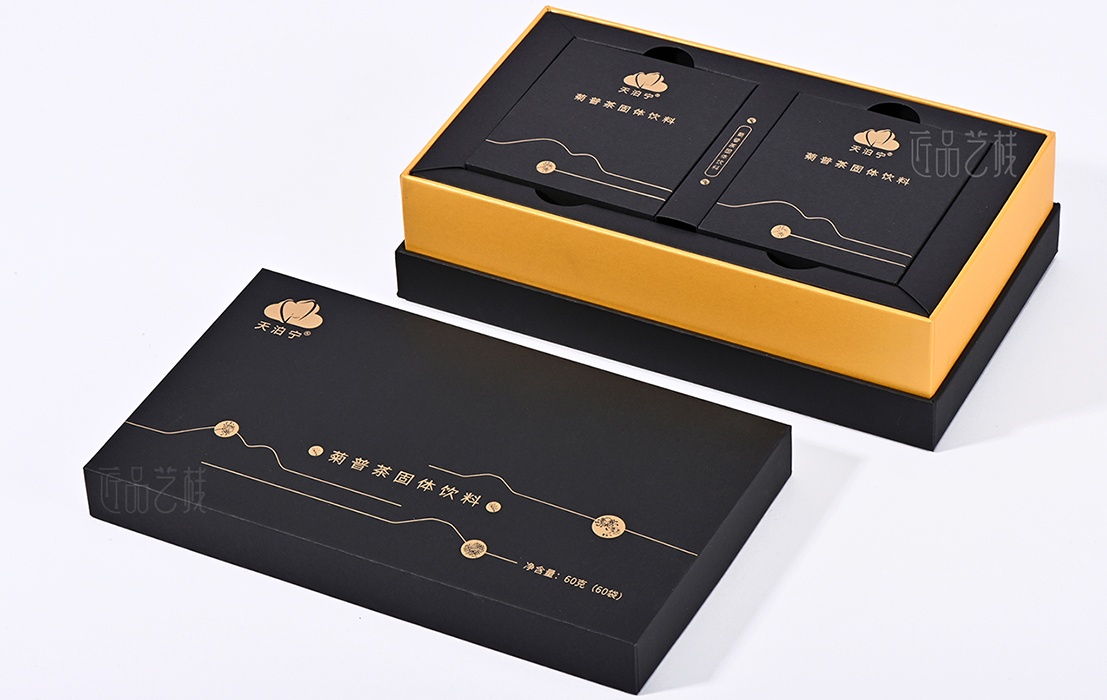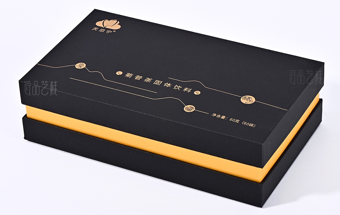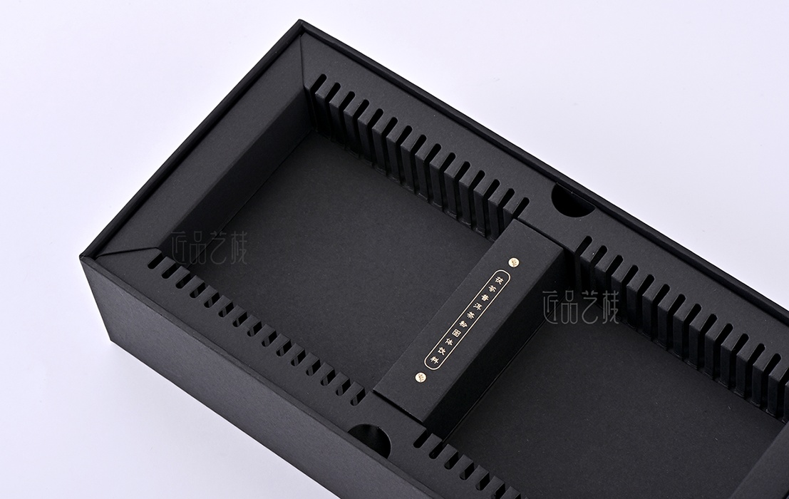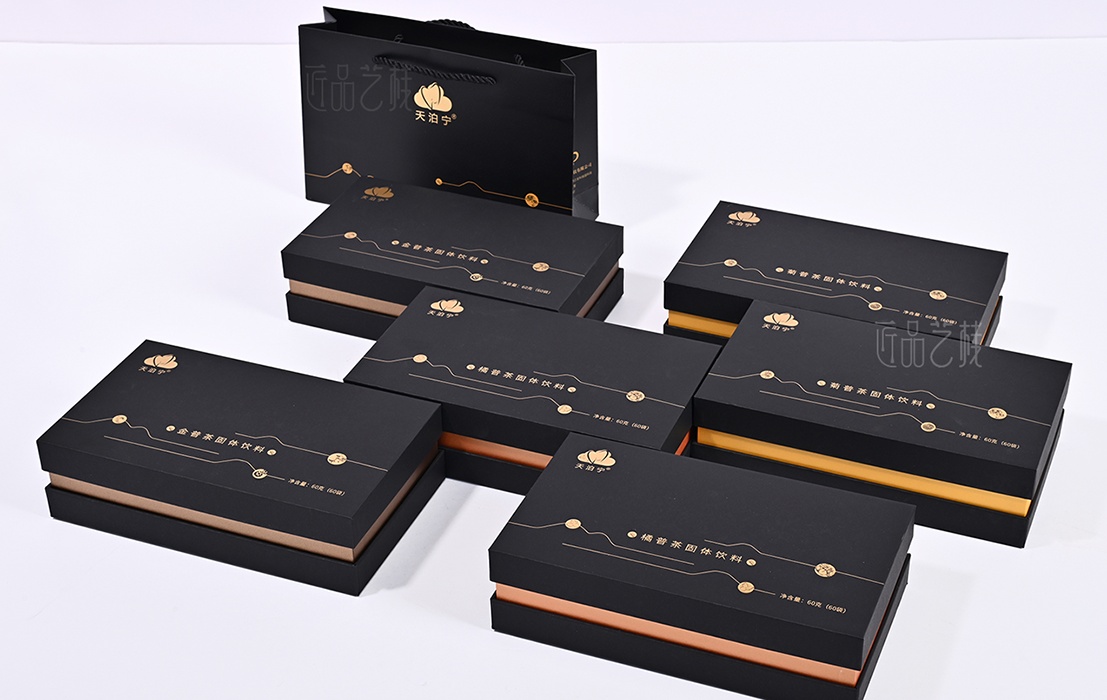 依托a级黑色卡纸为包装盒主体,点辍精致烫金工艺,